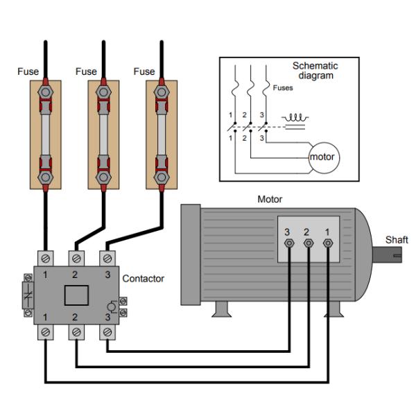 Examine this three-phase motor control circuit, where fuses protect against overcurrent and a three-pole relay (called a contactor) turns power on and off to the motor: